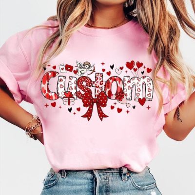 $15.99Custom Valentine Coquette T-Shirt with heart bow design. Perfect romantic gift with personalized name option. High-quality print-on-demand apparel for Valentine's Day. -