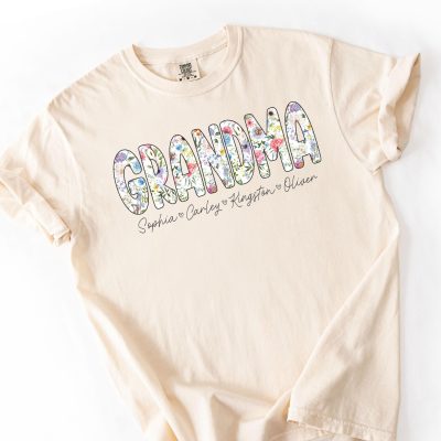 $21.99Personalized floral grandma t-shirt with custom grandkids names. Perfect sentimental gift featuring vibrant floral design on soft Comfort Colors tee. Customizable family apparel. -