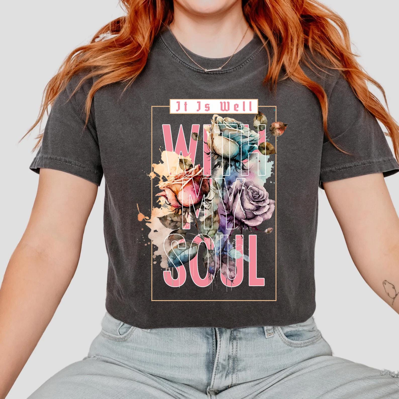 Step into a world of serene beauty with our Boho Cottagecore T-Shirt. This enchanting design blends delicate wildflowers with the timeless, comforting message “It Is Well With My Soul,” creating a piece that is both visually stunning and spiritually uplifting. Perfect for those who cherish nature, vintage aesthetics, and meaningful wear. 🎨👕