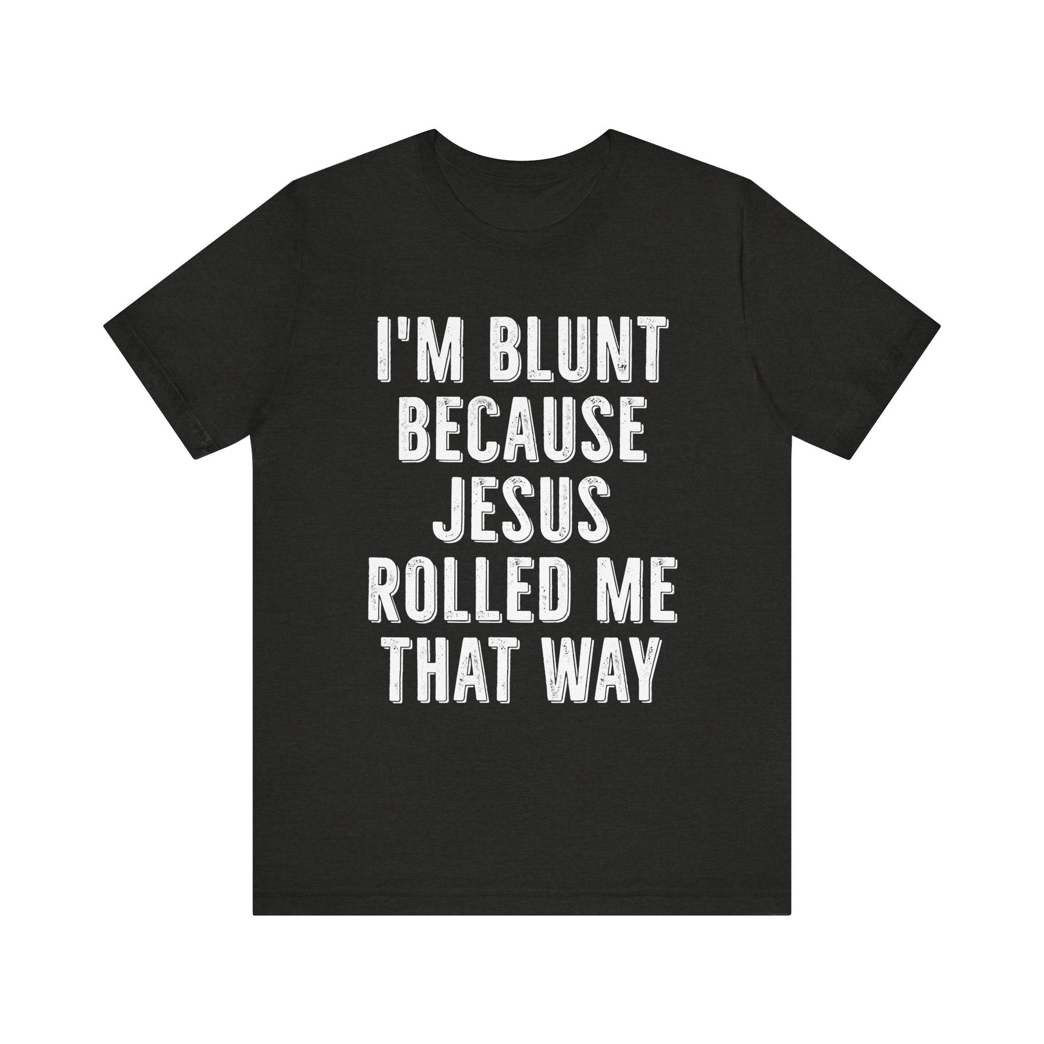 • Clever Wordplay Design: Features the humorous phrase “I’m Blunt Because Jesus Rolled Me That Way” with creative typography
