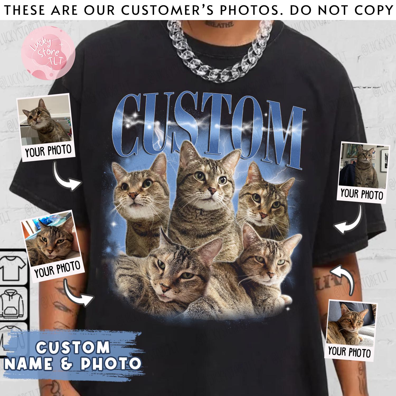 • Custom Photo Integration: Upload your cat’s photo to create a personalized bootleg-style design