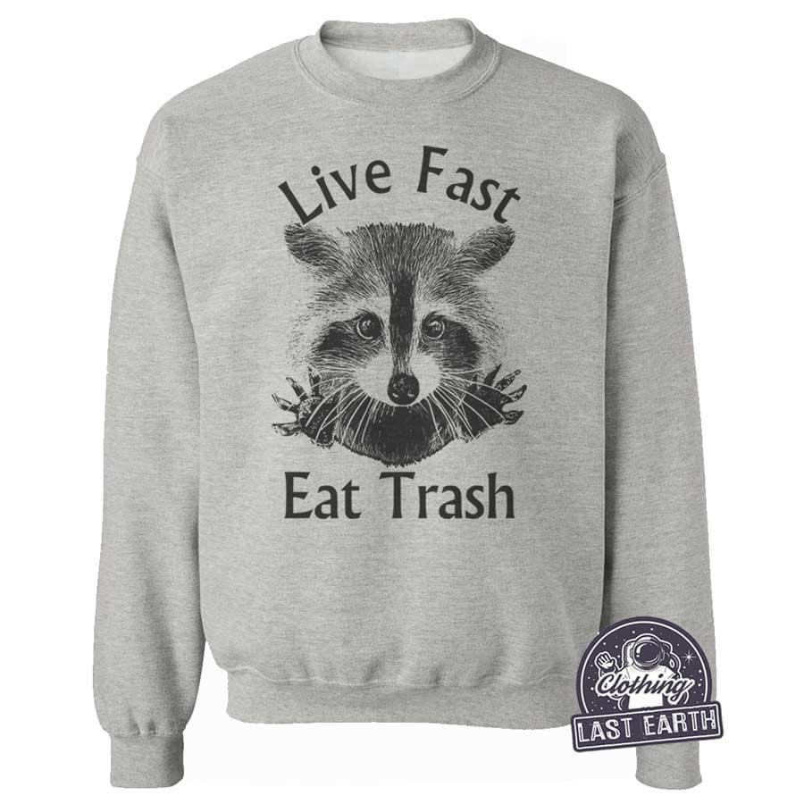 - Playful Raccoon Graphic: Featuring a cute raccoon illustration with the humorous “Live Fast Eat Trash” slogan