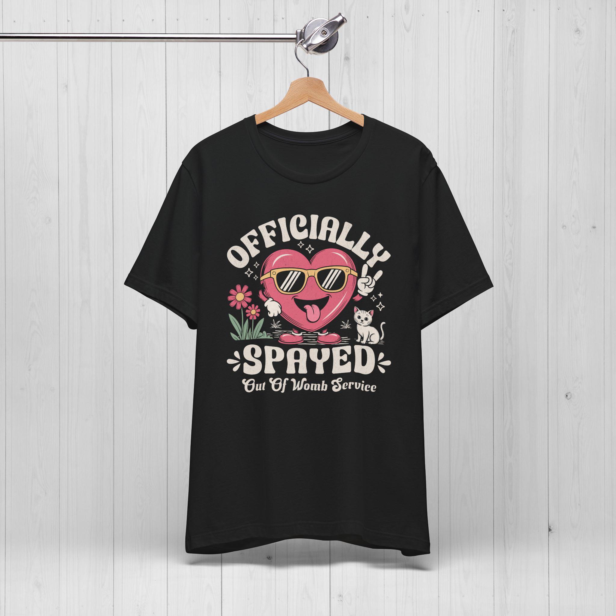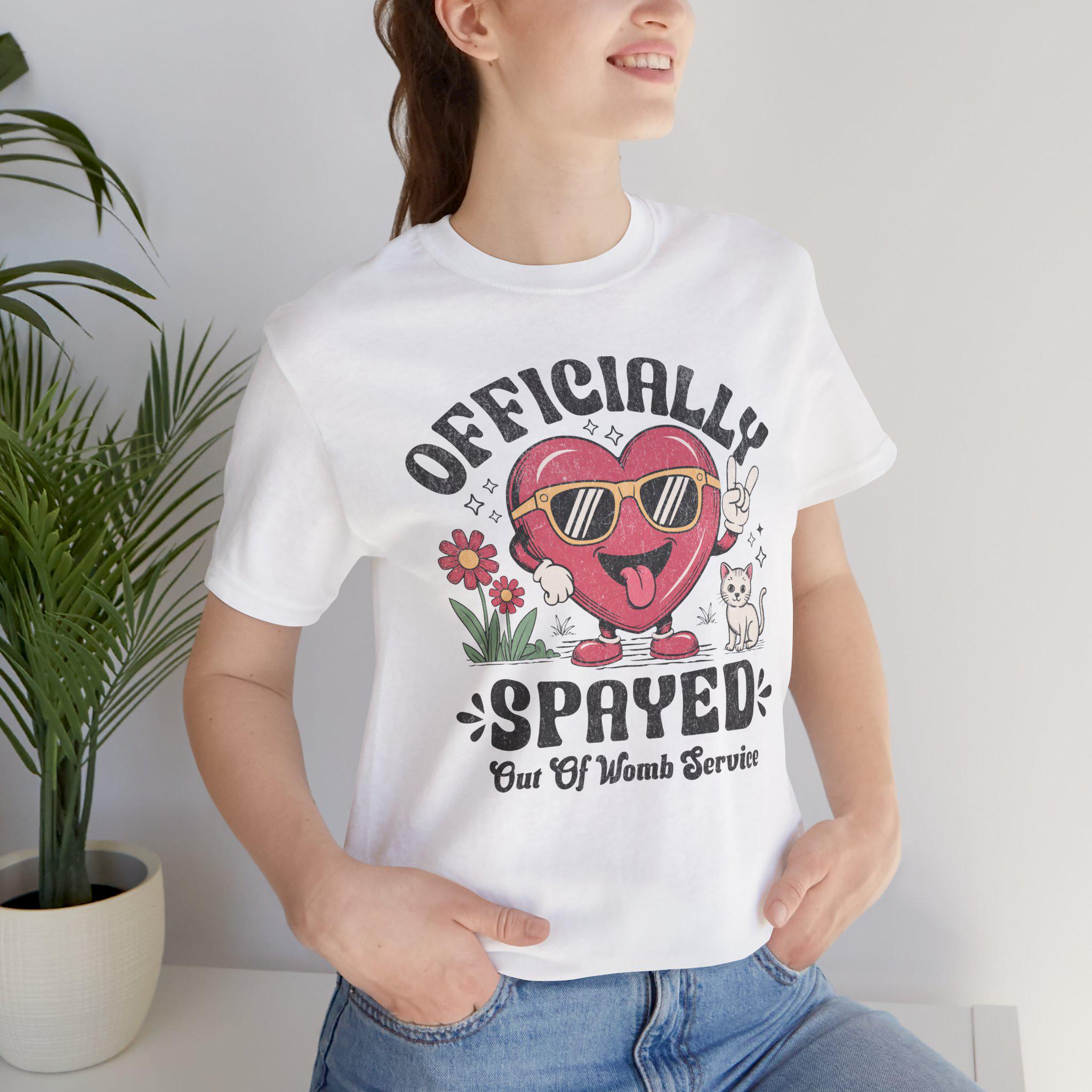 - Retro Heart Mascot Design: Features a cute, vintage-style heart character with “Officially Spayed” text